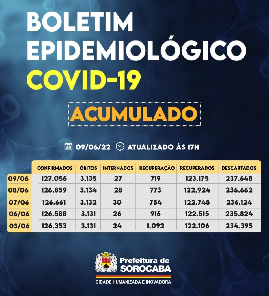 A Prefeitura de Sorocaba, por meio da Secretaria da Saúde (SES), registrou aumento do número de recuperados da Covid-19 nesta quinta-feira (9), chegando ao total de 123.175. Já, os casos confirmados com a doença passaram de 126.859 para 127.056 na cidade. Os óbitos confirmados aumentaram para 3.135. A taxa de letalidade no município é de 2,4%, abaixo da taxa estadual, que é de 3%, e acima da taxa nacional, que se encontra em 2,1%.