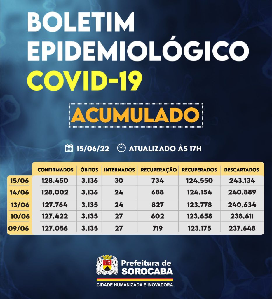 A Prefeitura de Sorocaba, por meio da Secretaria da Saúde (SES), registrou aumento do número de recuperados da Covid-19 nesta quarta-feira (15) chegando ao total de 124.550. Já, os casos confirmados com a doença passaram de 128.002 para 128.450 na cidade. Os óbitos confirmados se mantiveram em 3.136. A taxa de letalidade no município é de 2,4%, abaixo da taxa estadual, que é de 3%, e acima da taxa nacional, que se encontra em 2,1%.