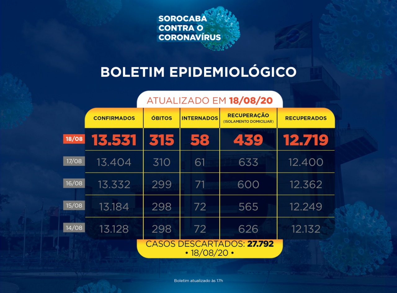 A Prefeitura de Sorocaba, por meio da Secretaria da Saúde (SES), registrou cinco novas morte confirmadas da Covid-19 nesta terça-feira (18). Já os casos confirmados com a doença passaram de 13.405 para 13.531 na cidade. Os óbitos aumentaram para 315.