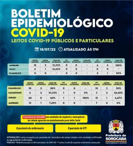 Sorocaba recebeu a notificação de mais 165 casos confirmados da Covid-19, 348 recuperados e um óbito, este ocorrido desde o dia 16 de julho de 2022, mas informado pelo hospital à Vigilância Epidemiológica e computado no dia de hoje (18 de julho). Do total de confirmados, oito estão internados em UTI e o total de pessoas em recuperação (isolamento domiciliar) é 83.