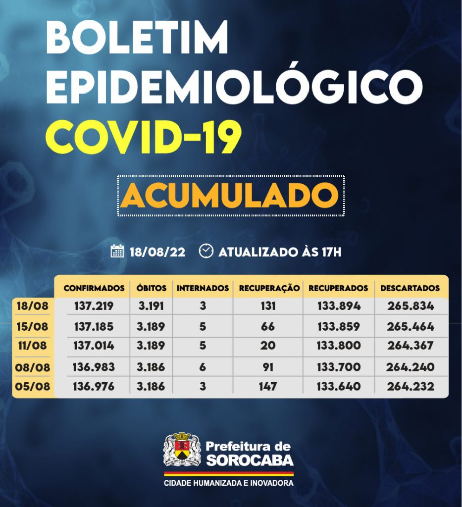Sorocaba recebeu a notificação de mais 34 casos confirmados da Covid-19, 35 recuperados e dois óbitos, estes ocorridos desde o dia 12 de agosto de 2022, mas informados pelos hospitais à Vigilância Epidemiológica e computados no dia de hoje (18 de agosto). Do total de confirmados, nenhum está internado em UTI e o total de pessoas em recuperação (isolamento domiciliar) é 131.