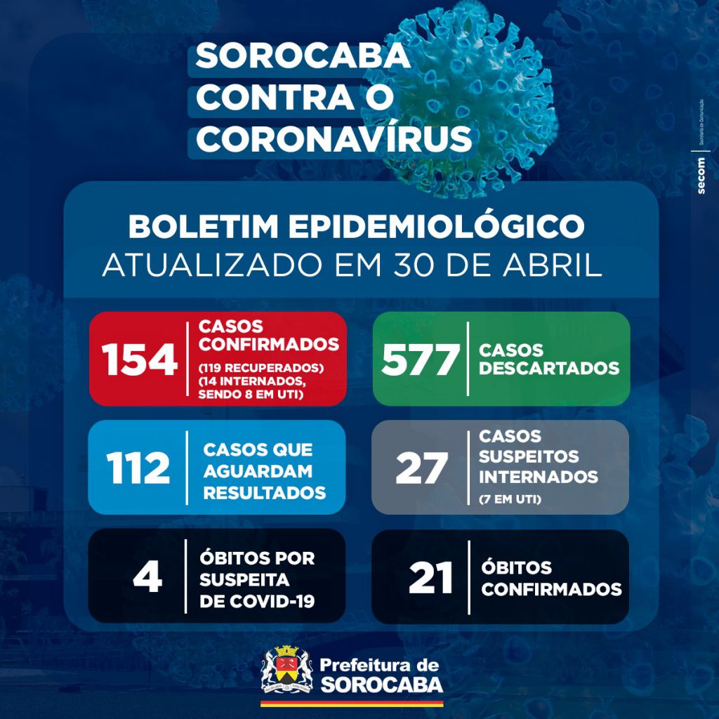 Sorocaba registrou mais 12 novos casos confirmados com a Covid-19 nesta quinta-feira (30). Com isso, já são 154 casos confirmados na cidade. Deste total, 14 estão internados (oito em UTI) e 119 já se encontram recuperados. Os óbitos com a confirmação da doença continuam em 21.