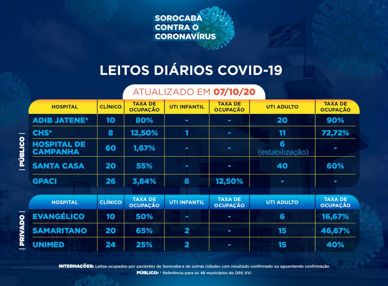 Sorocaba recebeu a notificação de mais 62 novos casos confirmados da Covid-19 nesta quarta-feira (07). Do total de confirmados, 41 estão internados (23 em UTI) e o total de pessoas em recuperação (isolamento domiciliar) é 240.