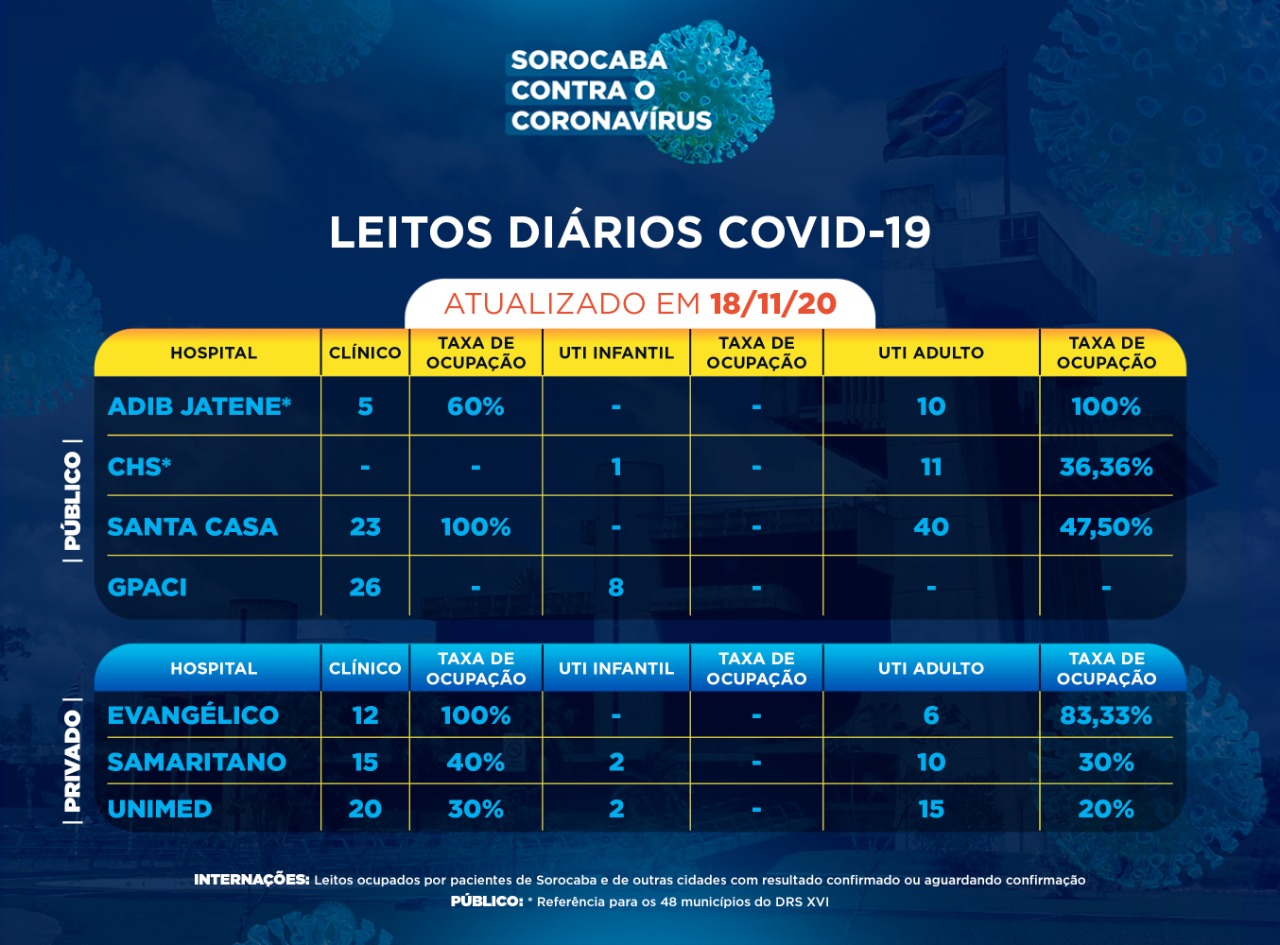 Sorocaba recebeu a notificação de mais 194 novos casos confirmados da Covid-19 nesta quarta-feira (18). Do total de confirmados, 46 estão internados (22 em UTI) e o total de pessoas em recuperação (isolamento domiciliar) é 240.