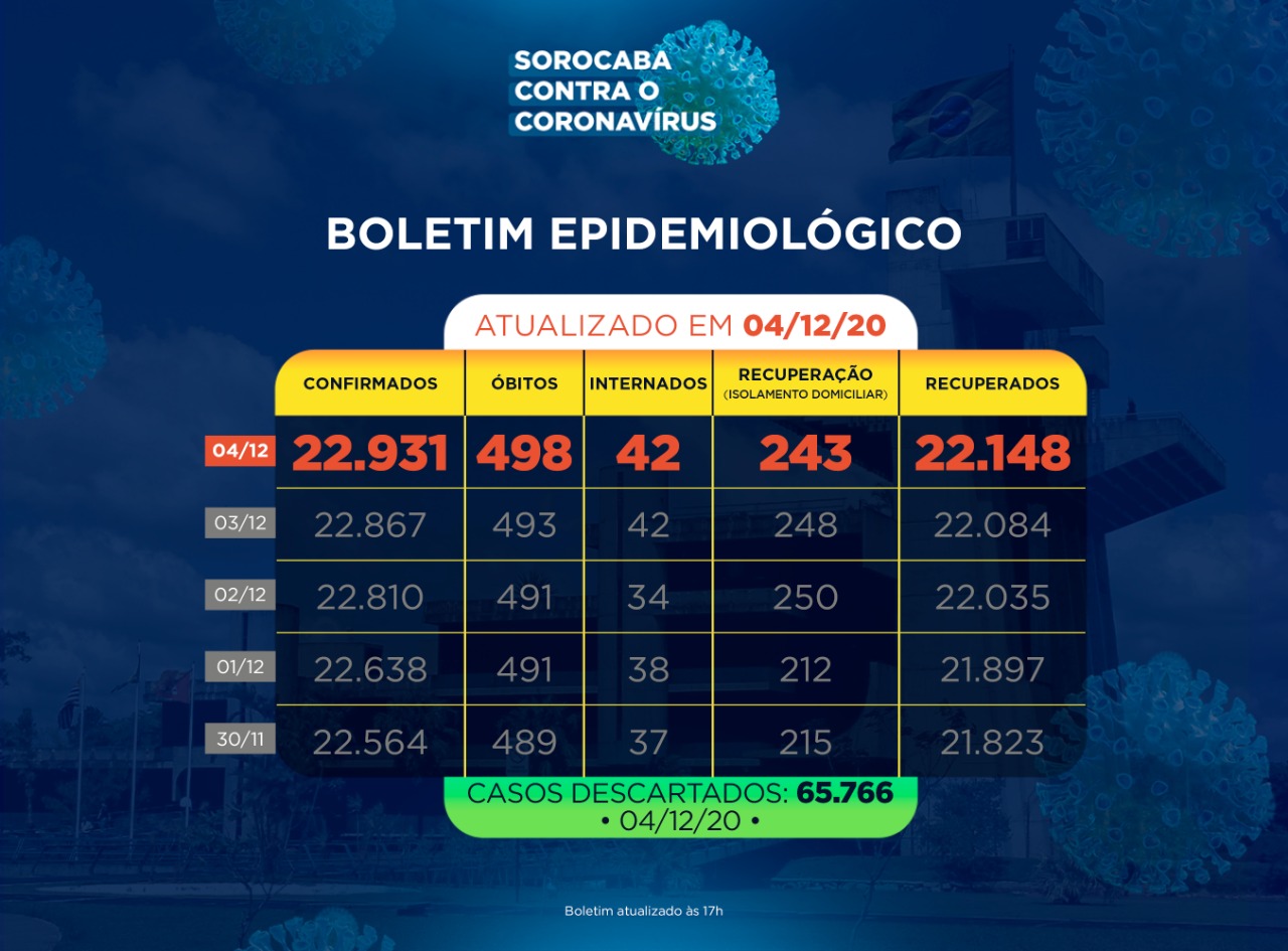 A Prefeitura de Sorocaba, por meio da Secretaria da Saúde (SES), registrou 22.148 recuperados da Covid-19, nesta sexta-feira (04). Já os casos confirmados com a doença passaram de 22.867 para 22.931 na cidade. Os óbitos com a confirmação da doença aumentaram para 498.