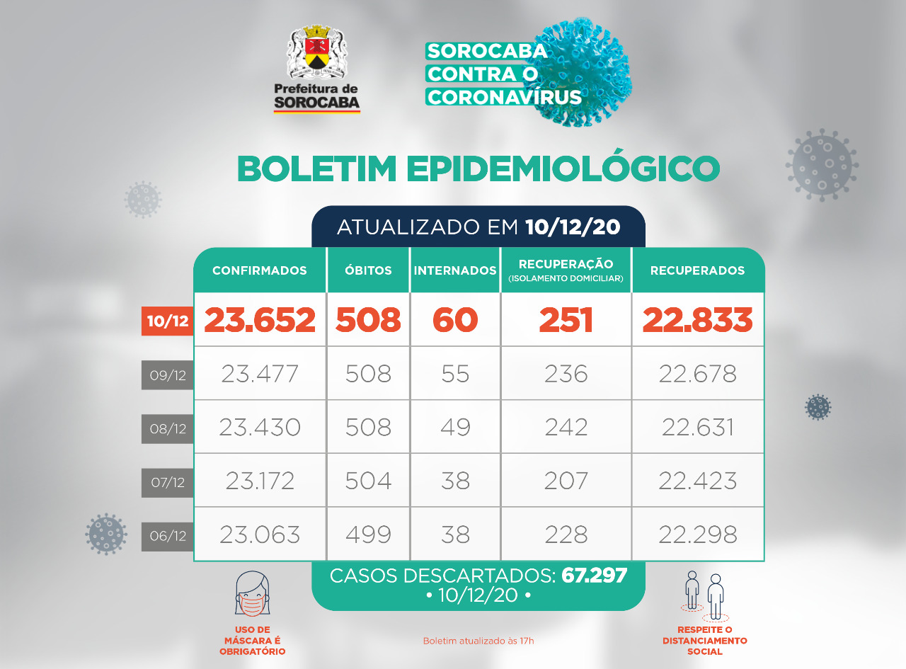 A Prefeitura de Sorocaba, por meio da Secretaria da Saúde (SES), registrou 22.833 recuperados da Covid-19, nesta quinta-feira (10). Já os casos confirmados com a doença passaram de 23.477 para 23.652 na cidade. Os óbitos com a confirmação da doença se mantiveram em 508.