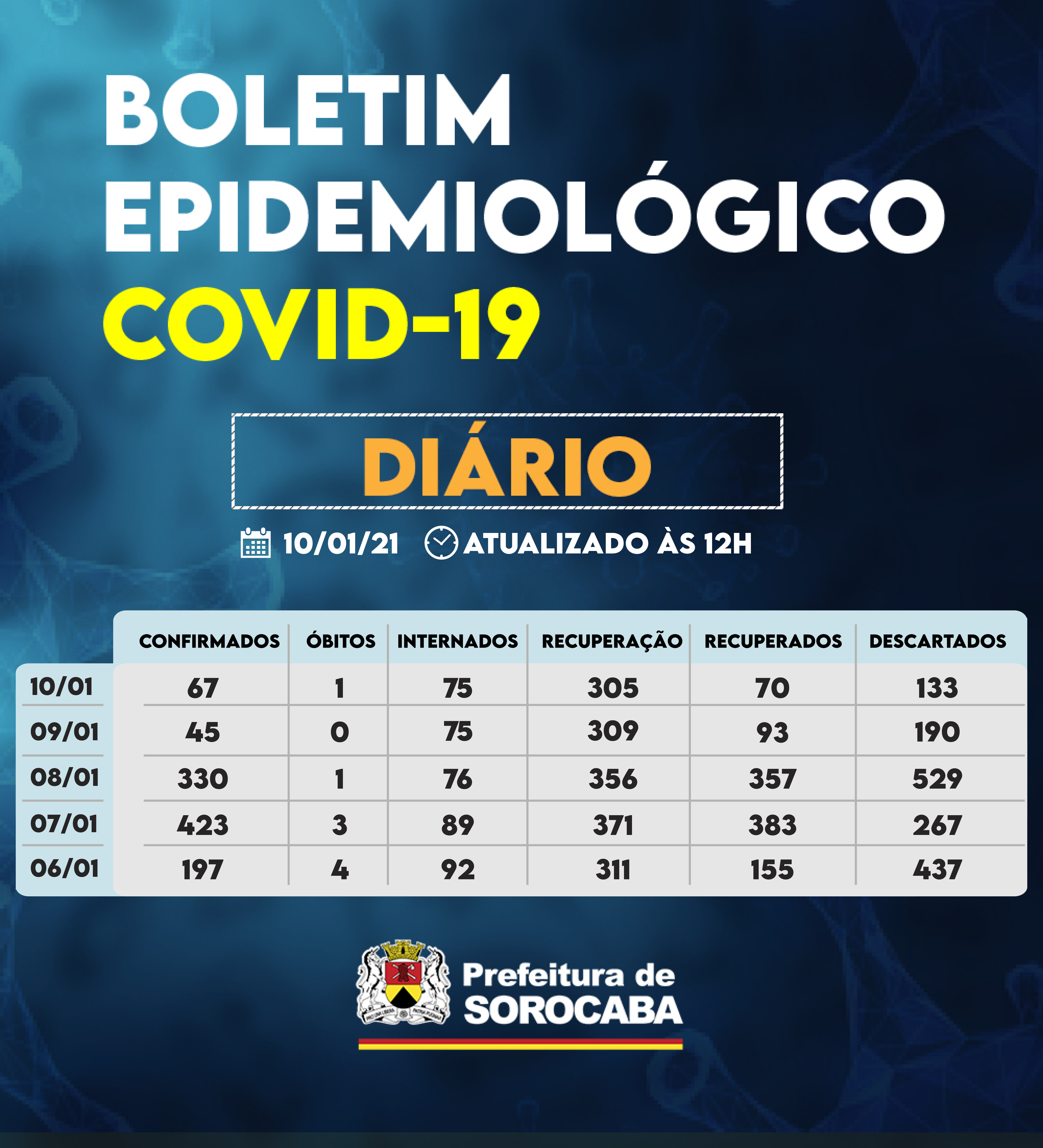 Sorocaba recebeu a notificação de mais 67 casos confirmados da Covid-19, 70 recuperados e um óbito neste domingo (10). Do total de confirmados, 75 estão internados (34 em UTI) e o total de pessoas em recuperação (isolamento domiciliar) é 305.