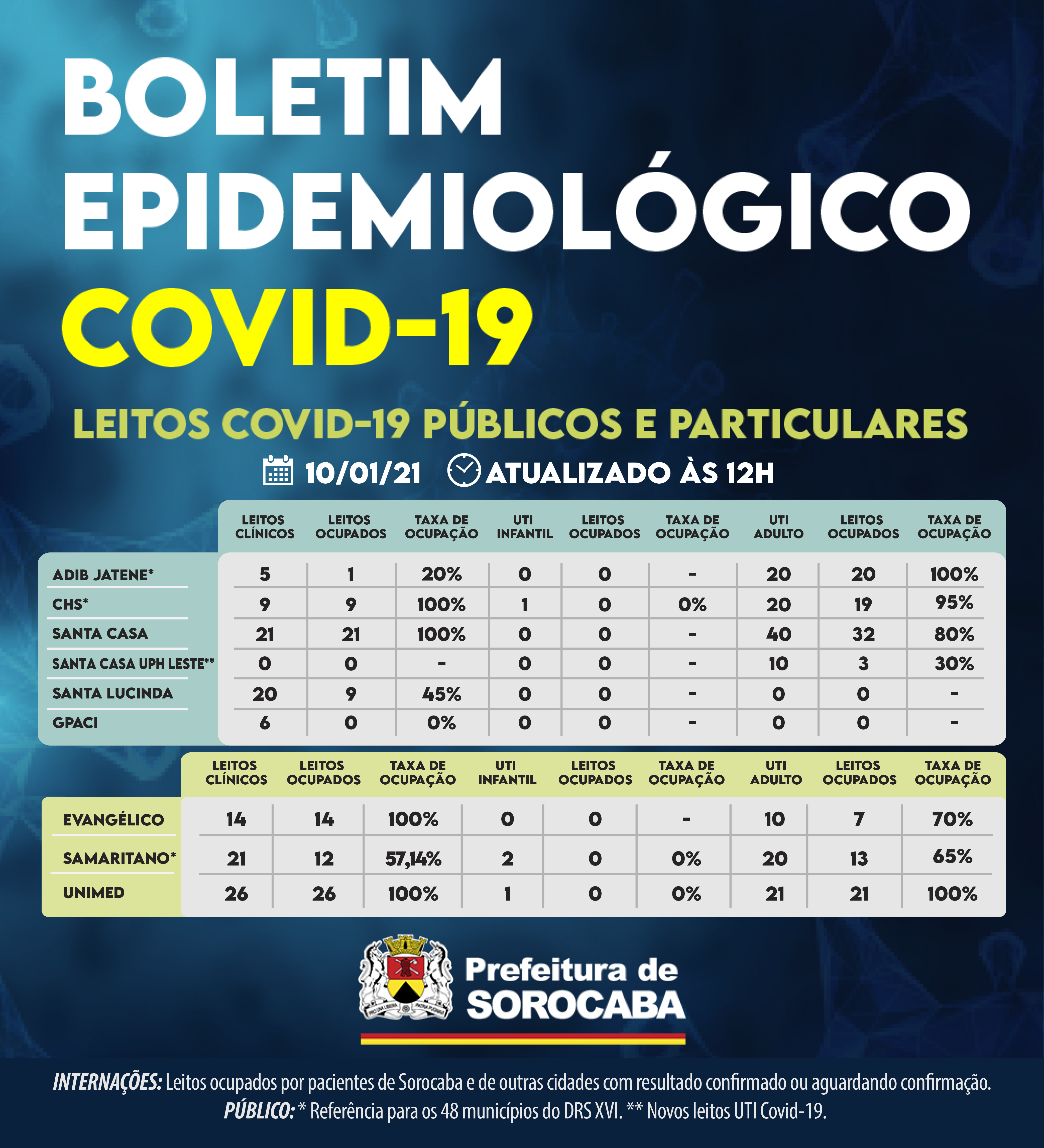 No censo diário de leitos da Covid-19 deste domingo (10), o hospital estadual Adib Jatene está com um leito clínico Covid ocupado, sendo cinco pactuados. Já os 20 leitos de UTI Covid (Unidade de Terapia Intensiva) encontram-se 100% ocupados. Outro hospital de esfera estadual, o CHS (Conjunto Hospitalar de Sorocaba), possui nove leitos clínicos Covid e nove estão ocupados. O único leito de UTI infantil Covid está desocupado. Dos 20 leitos de UTI Covid disponibilizados neste hospital, 19 estão ocupados.