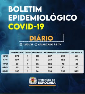 Sorocaba recebeu a notificação de mais 273 casos confirmados da Covid-19, 220 recuperados e um óbito nesta terça-feira (12). Do total de confirmados, 60 estão internados (33 em UTI) e o total de pessoas em recuperação (isolamento domiciliar) é 327.