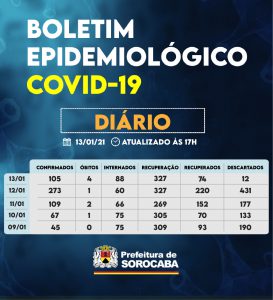 Sorocaba recebeu a notificação de mais 105 casos confirmados da Covid-19, 74 recuperados e quatro óbitos nesta quarta-feira (13). Do total de confirmados, 88 estão internados (41 em UTI) e o total de pessoas em recuperação (isolamento domiciliar) é 326.