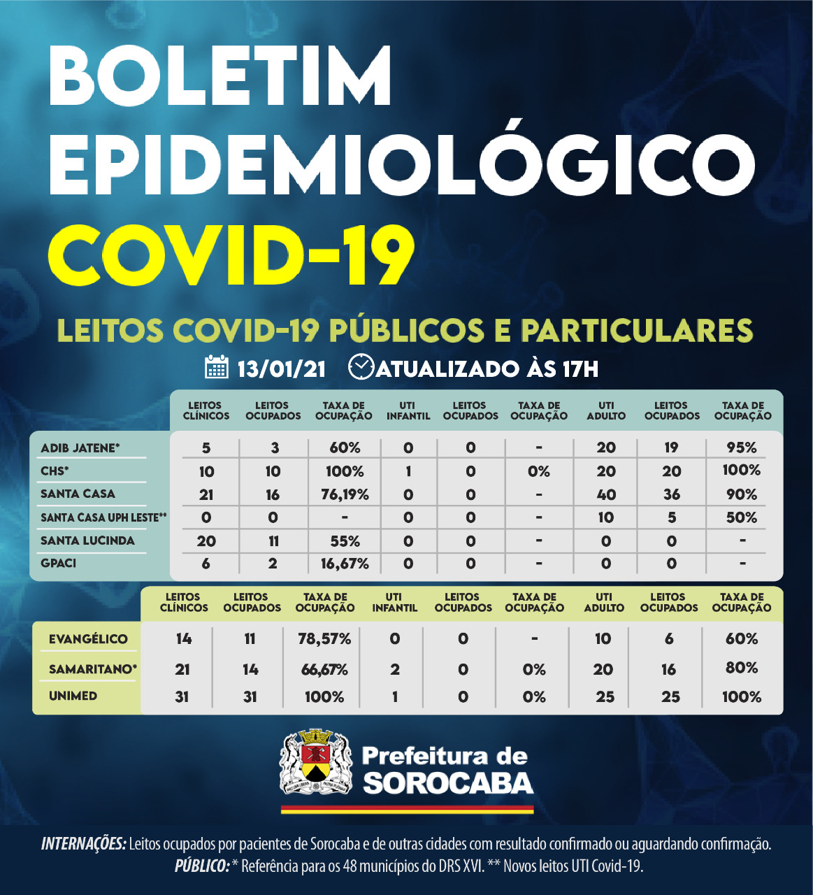 No censo diário de leitos da Covid-19 desta quarta-feira (13), o hospital estadual Adib Jatene está com três leitos clínicos Covid ocupado, sendo cinco pactuados. Já os 20 leitos de UTI Covid (Unidade de Terapia Intensiva) encontram-se 95% ocupados. Outro hospital de esfera estadual, o CHS (Conjunto Hospitalar de Sorocaba), possui 10 leitos clínicos Covid e 10 estão ocupados. O único leito de UTI infantil Covid está desocupado. Dos 20 leitos de UTI Covid disponibilizados neste hospital, 20 estão ocupados.