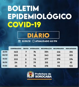 Sorocaba recebeu a notificação de mais 462 casos confirmados da Covid-19, 416 recuperados e sete óbitos nesta quinta-feira (21). Do total de confirmados, 74 estão internados (35 em UTI) e o total de pessoas em recuperação (isolamento domiciliar) é 384.