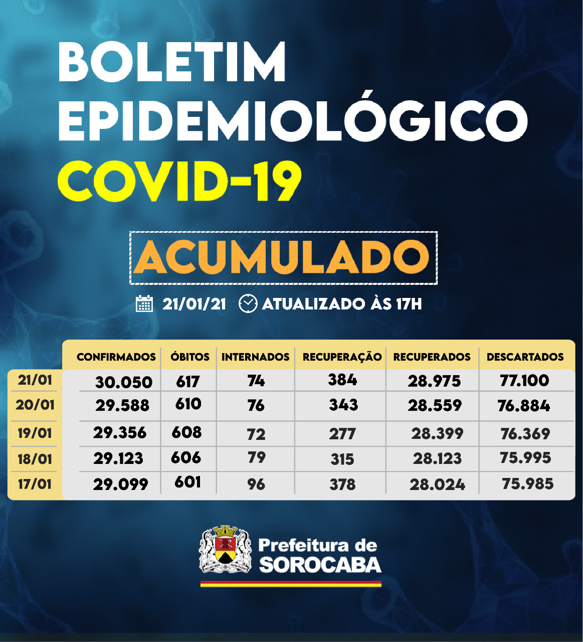 Sorocaba registra 30.050 casos da Covid-19, 28.975 recuperados e 617 óbitos