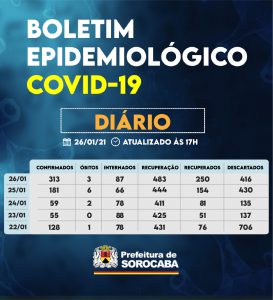 Sorocaba recebeu a notificação de mais 313 casos confirmados da Covid-19, 250 recuperados e três óbitos nesta terça-feira (26). Do total de confirmados, 87 estão internados (46 em UTI) e o total de pessoas em recuperação (isolamento domiciliar) é 483.