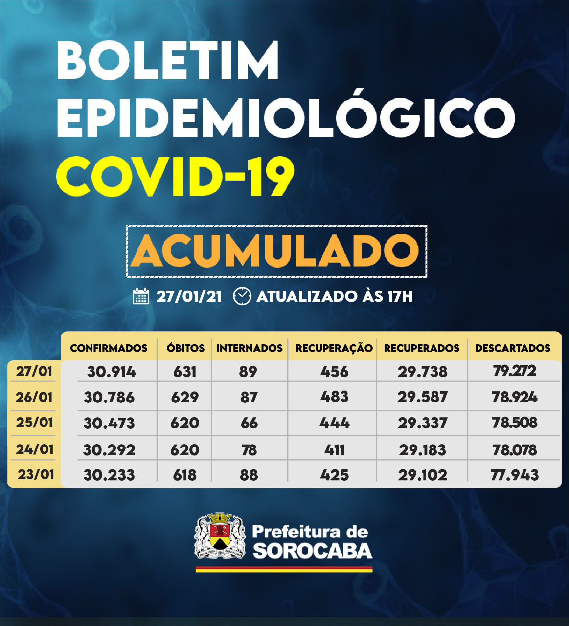 A Prefeitura de Sorocaba, por meio da Secretaria da Saúde (SES), registrou aumento nos recuperados da Covid-19 nesta quarta-feira (27), chegando ao total de 29.738. Já, os casos confirmados com a doença passaram de 30.786 para 30.914 na cidade. Os óbitos com a confirmação da doença aumentaram para 631 e a taxa de letalidade no município é de 2,04%, abaixo da taxa estadual, que é de 3% e da nacional, que se encontra em 2,5%.