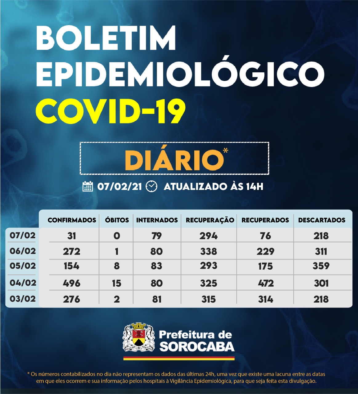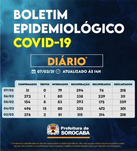 Sorocaba recebeu a notificação de mais 31 casos confirmados da Covid-19, 76 recuperados e não houve notificação de novos óbitos. Do total de confirmados, 79 estão internados (42 em UTI) e o total de pessoas em recuperação (isolamento domiciliar) é 294.