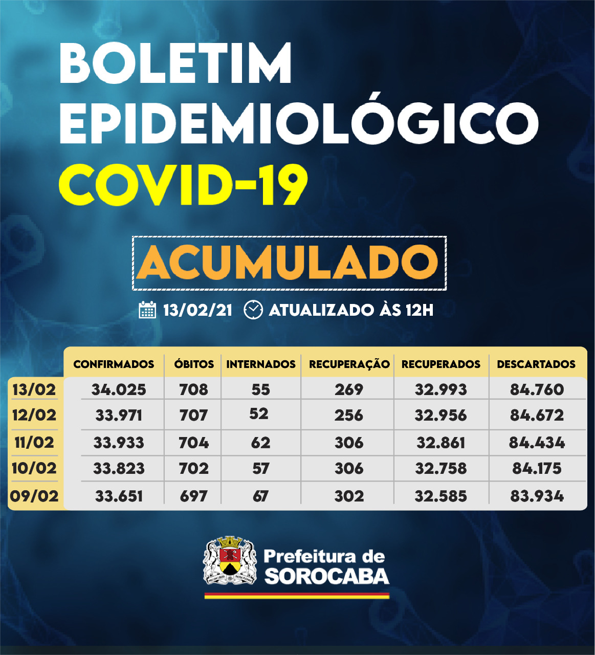 A Prefeitura de Sorocaba, por meio da Secretaria da Saúde (SES), registrou aumento nos recuperados da Covid-19 neste sábado (13), chegando ao total de 32.993. Já, os casos confirmados com a doença passaram de 33.971 para 34.025 na cidade. Os óbitos com a confirmação da doença aumentaram para 708 e a taxa de letalidade no município é de 2,08%, abaixo da taxa estadual, que é de 2,9% e da nacional, que se encontra em 2,4%.