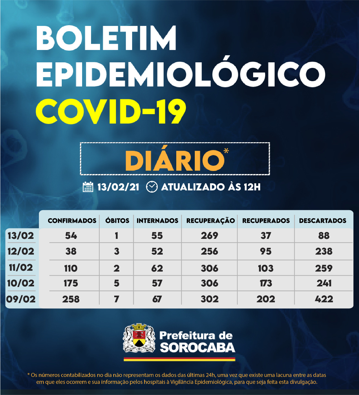 Sorocaba recebeu a notificação de mais 54 casos confirmados da Covid-19, 37 recuperados e um óbito, este ocorrido no dia 11 de fevereiro, mas informados pelo hospital à Vigilância Epidemiológica e computado apenas no dia de hoje (13). Do total de confirmados, 55 estão internados (30 em UTI) e o total de pessoas em recuperação (isolamento domiciliar) é 269.