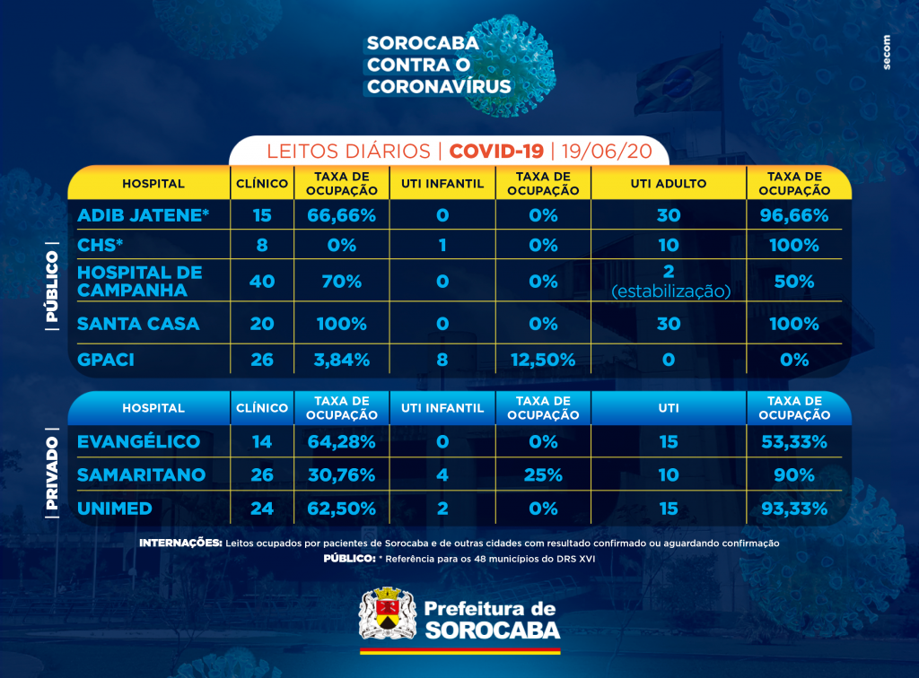 Também nesta sexta-feira (19), a cidade contabilizou mais uma morte por conta da Covid-19. A vítima foi uma mulher de 75 anos que tinha hipertensão, obesidade e diabetes. Ela faleceu no dia 16 de junho num hospital público de Sorocaba.
