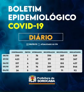 Sorocaba recebeu a notificação de mais 330 casos confirmados da Covid-19, 357 recuperados e um óbito nesta sexta-feira (8). Do total de confirmados, 76 estão internados (39 em UTI) e o total de pessoas em recuperação (isolamento domiciliar) é 356.