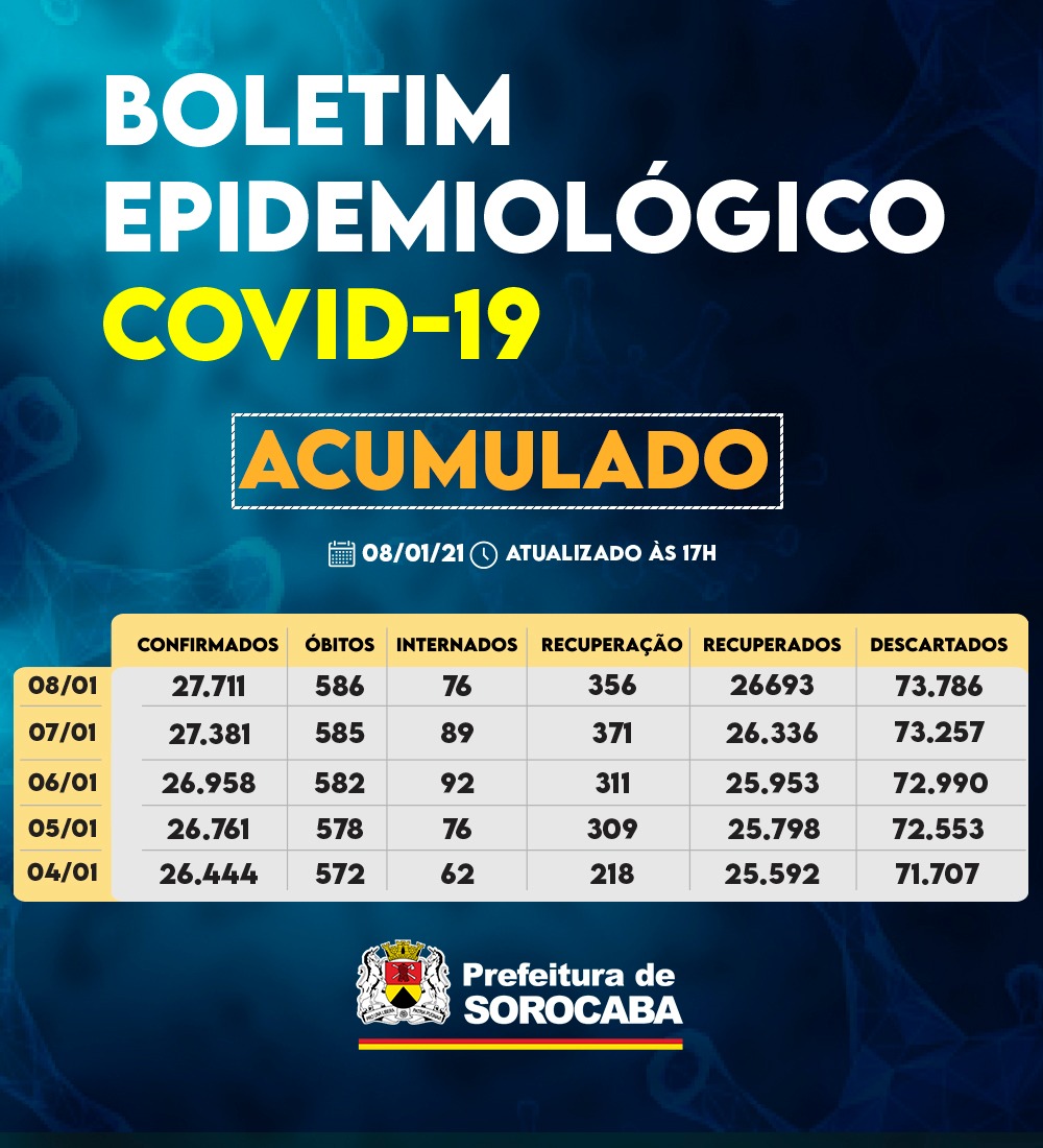 A Prefeitura de Sorocaba, por meio da Secretaria da Saúde (SES), registrou aumento nos recuperados da Covid-19 nesta sexta-feira (8) chegando ao total de 26.693. Já, os casos confirmados com a doença passaram de 27.381 para 27.711 na cidade. Os óbitos com a confirmação da doença aumentaram para 586 e a taxa de letalidade no município é de 2,11%, abaixo da taxa estadual, que é de 3,1% e da nacional, que se encontra em 2,5%.
