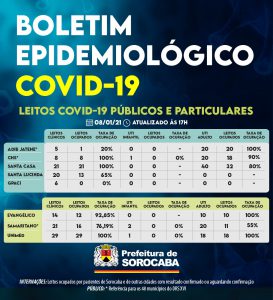 Os hospitais contratualizados pela Prefeitura de Sorocaba para oferecer leitos covid, como a Santa Casa, está com 100% de ocupação nos leitos clínicos covid. Ou seja, dos 21 existentes, 21 possuem pacientes. A ocupação de UTI covid da Santa Casa é de 80%, o que representa 32 leitos ocupados dos 40 contratados. O hospital Santa Lucinda possui um total de 20 leitos clínicos covid e apenas 13 estão ocupados. Dos seis leitos clínicos covid do GPACI, nenhum está ocupado.