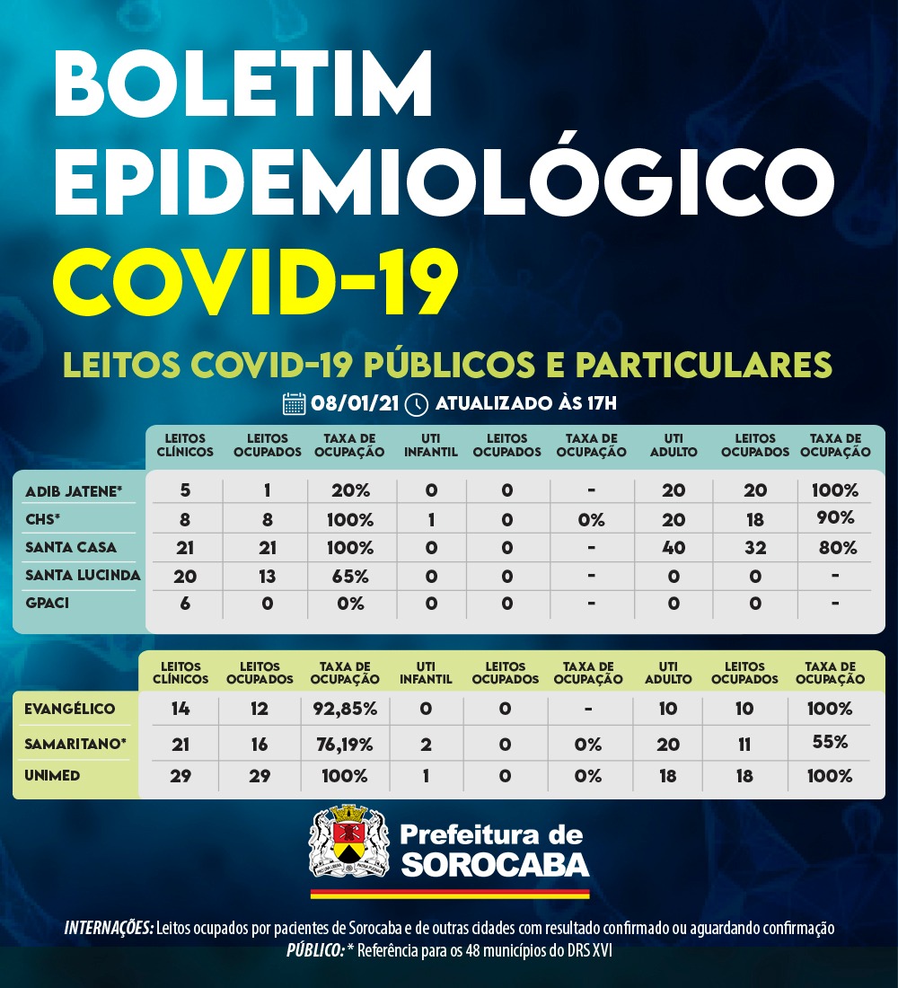 No censo diário de leitos da Covid-19 desta sexta-feira (8), o hospital estadual Adib Jatene está com um leito clínico covid ocupado, sendo cinco pactuados. Já os 20 leitos de UTI covid (Unidade de Terapia Intensiva) encontram-se 100% ocupados. Outro hospital de esfera estadual, o CHS (Conjunto Hospitalar de Sorocaba), possui oito leitos clínicos covid e oito estão ocupados. O único leito de UTI infantil covid está desocupado. Dos 20 leitos de UTI covid disponibilizados neste hospital, 18 estão ocupados.