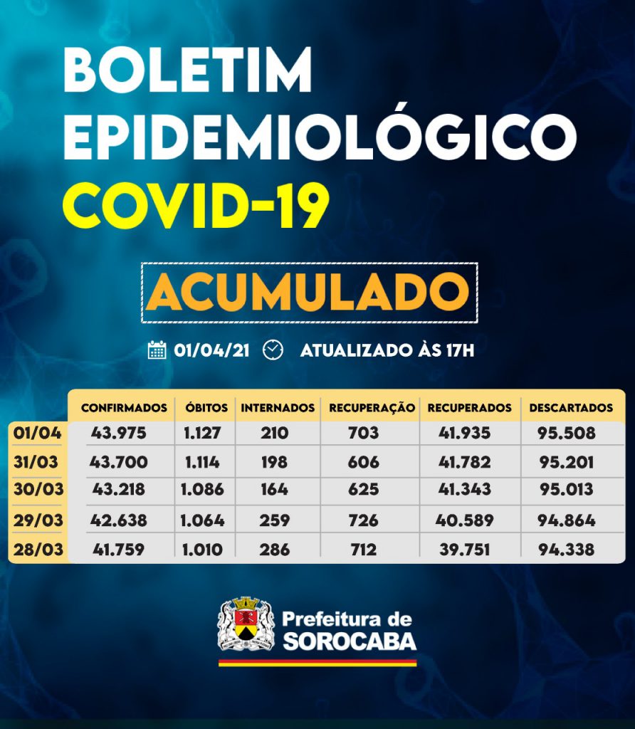 A Prefeitura de Sorocaba, por meio da Secretaria da Saúde (SES), registrou aumento do número de recuperados da Covid-19 nesta quinta-feira (1), chegando ao total de 41.935. Já, os casos confirmados com a doença passaram de 43.700 para 43.975 na cidade. Os óbitos com a confirmação da doença subiram para 1.127 e a taxa de letalidade no município é de 2,5%, abaixo da taxa estadual, que é de 3% e a mesma da nacional, que se encontra em 2,5%.