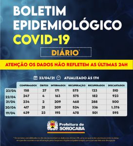Sorocaba recebeu a notificação de mais 158 casos confirmados da Covid-19, 123 recuperados e 27 óbitos, estes ocorridos desde o dia 12 de abril, mas informados pelos hospitais à Vigilância Epidemiológica e computados apenas no dia de hoje (23 de abril). Do total de confirmados, 171 estão internados (101 em UTI) e o total de pessoas em recuperação (isolamento domiciliar) é 575.