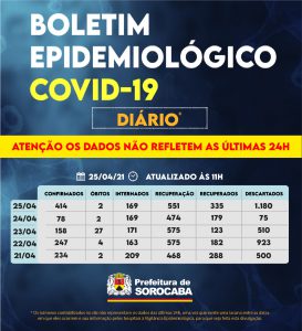 Sorocaba recebeu a notificação de mais 414 casos confirmados da Covid-19, 335 recuperados e dois óbitos, estes ocorridos desde o dia 23 de abril, mas informados pelos hospitais à Vigilância Epidemiológica e computados apenas no dia de hoje (25 de abril). Do total de confirmados, 169 estão internados (92 em UTI) e o total de pessoas em recuperação (isolamento domiciliar) é 551.