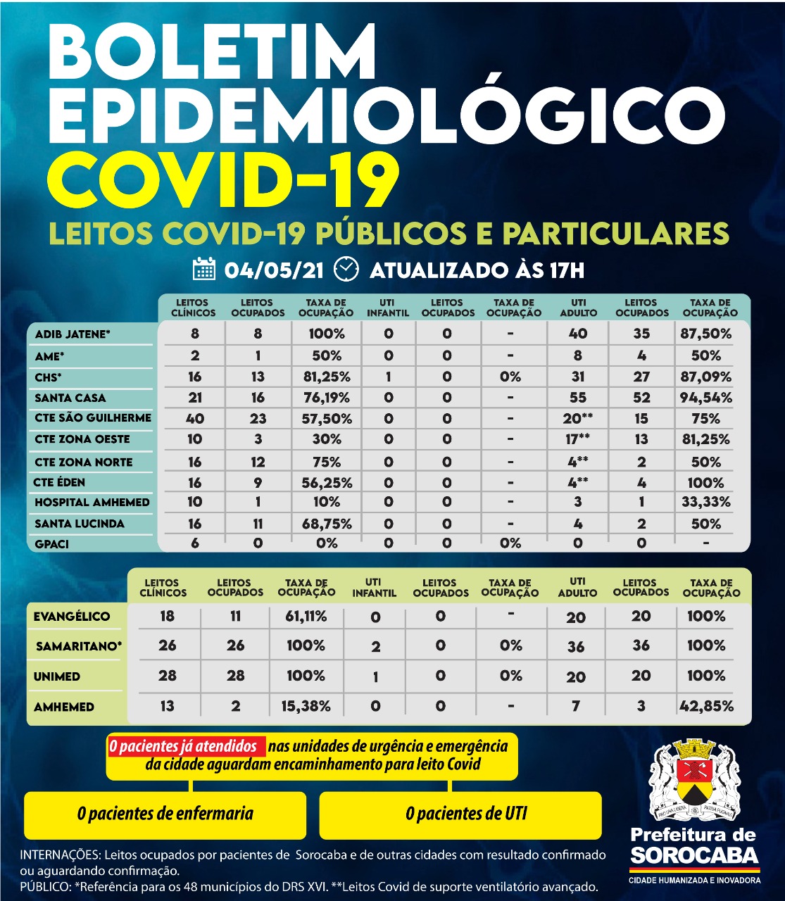 No censo diário de leitos da Covid-19 desta terça-feira (4), no Hospital Estadual Adib Jatene, oito leitos clínicos Covid estão ocupados, sendo oito pactuados, assim como os 40 leitos de UTI Covid (Unidade de Terapia Intensiva) encontram-se 87,50% ocupados. Outro hospital de esfera estadual, o Conjunto Hospitalar de Sorocaba (CHS), possui 16 leitos clínicos Covid e 13 estão ocupados. O único leito de UTI infantil Covid encontra-se sem paciente. Dos 31 leitos de UTI Covid disponibilizados neste hospital, 27 estão ocupados. O AME possui dois leitos clínicos covid e um está ocupado. Dos oito leitos de UTI Covid deste local, quatro possuem pacientes.