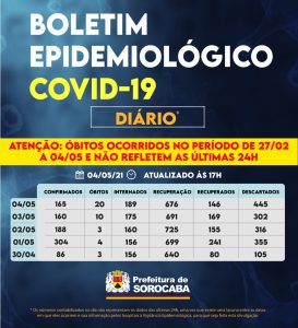 Sorocaba recebeu a notificação de mais 165 casos confirmados da Covid-19, 146 recuperados e 20 óbitos, estes ocorridos desde o dia 27 de fevereiro, mas informados pelos hospitais à Vigilância Epidemiológica e computados apenas no dia de hoje (4 de maio). Do total de confirmados, 189 estão internados (102 em UTI) e o total de pessoas em recuperação (isolamento domiciliar) é 676.