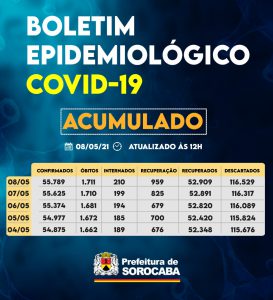 A Prefeitura de Sorocaba, por meio da Secretaria da Saúde (SES), registrou aumento do número de recuperados da Covid-19 neste sábado (8), chegando ao total de 52.909. Já, os casos confirmados com a doença passaram de 55.625 para 55.789 na cidade. Os óbitos com a confirmação da doença subiram para 1.711 e a taxa de letalidade no município é de 3%, abaixo da taxa estadual, que é de 3,4%, e acima da taxa nacional, que se encontra em 2,8%.