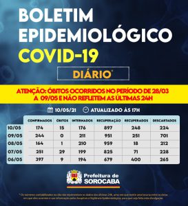 Sorocaba recebeu a notificação de mais 174 casos confirmados da Covid-19, 248 recuperados e 15 óbitos, estes ocorridos desde o dia 28 de março, mas informados pelos hospitais à Vigilância Epidemiológica e computados apenas no dia de hoje (10 de maio). Do total de confirmados, 176 estão internados (100 em UTI) e o total de pessoas em recuperação (isolamento domiciliar) é 897.