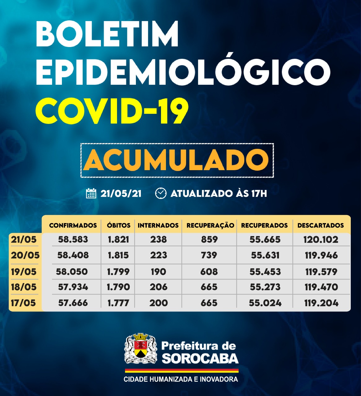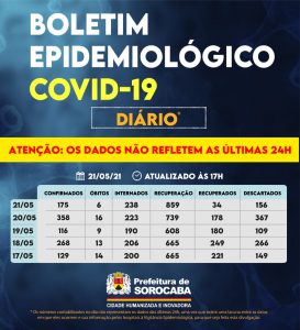 Sorocaba recebeu a notificação de mais 175 casos confirmados da Covid-19, 34 recuperados e seis óbitos, estes ocorridos desde o dia 12 de maio, mas informados pelos hospitais à Vigilância Epidemiológica e computados apenas no dia de hoje (21 de maio). Do total de confirmados, 223 estão internados (113 em UTI) e o total de pessoas em recuperação (isolamento domiciliar) é 859.