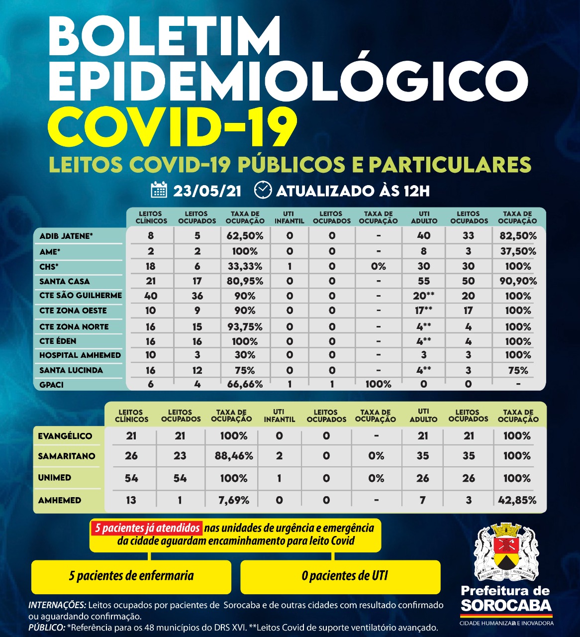 No censo diário de leitos da Covid-19 deste domingo (23), no Hospital Estadual Adib Jatene, cinco leitos clínicos Covid estão ocupados, sendo oito pactuados. Já os 40 leitos de UTI Covid (Unidade de Terapia Intensiva) encontram-se 82,50% ocupados. Outro hospital de esfera estadual, o Conjunto Hospitalar de Sorocaba (CHS), possui 18 leitos clínicos Covid e seis estão ocupados. O único leito de UTI infantil Covid encontra-se sem paciente. Dos 30 leitos de UTI Covid disponibilizados neste hospital, 30 estão ocupados. O AME possui dois leitos clínicos covid e os dois estão ocupados. Dos oito leitos de UTI Covid deste local, três possuem pacientes.