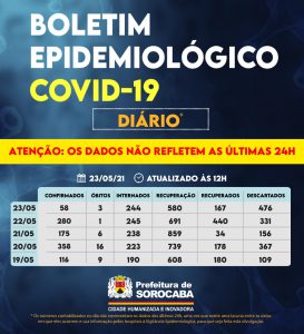 Sorocaba recebeu a notificação de mais 58 casos confirmados da Covid-19, 167 recuperados e três óbitos, estes ocorridos desde o dia 21 de maio, mas informados pelos hospitais à Vigilância Epidemiológica e computados no dia de hoje (23 de maio). Do total de confirmados, 244 estão internados (112 em UTI) e o total de pessoas em recuperação (isolamento domiciliar) é 580.