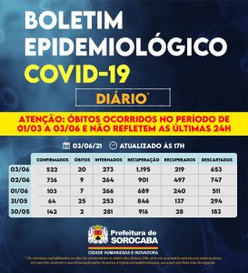 Sorocaba recebeu a notificação de mais 522 casos confirmados da Covid-19, 219 recuperados e 20 óbitos, estes ocorridos desde o dia 1 de março, mas informados pelos hospitais à Vigilância Epidemiológica e computados apenas no dia de hoje (3 de junho). Do total de confirmados, 273 estão internados (148 em UTI) e o total de pessoas em recuperação (isolamento domiciliar) é 1.195.