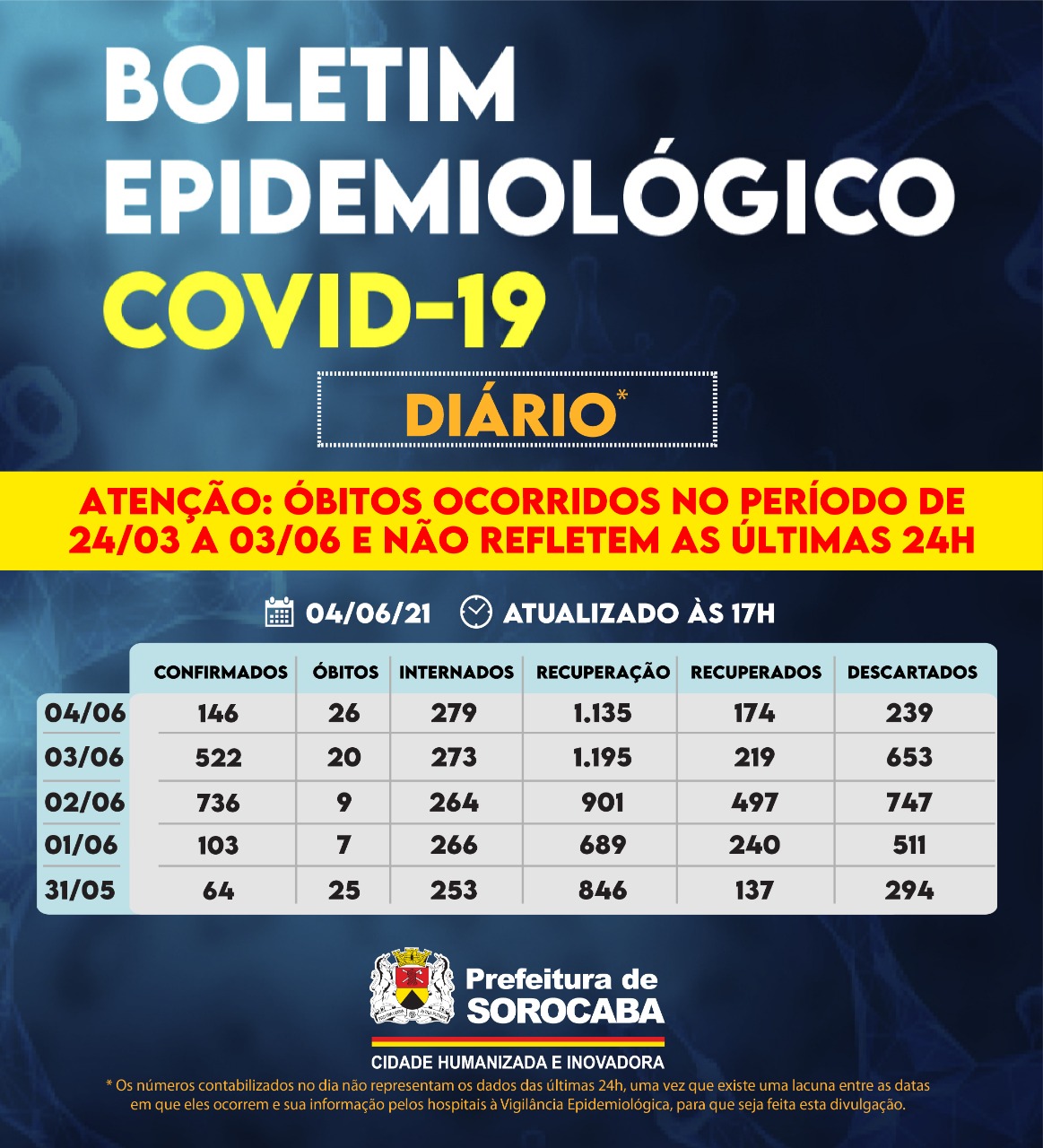 Sorocaba recebeu a notificação de mais 146 casos confirmados da Covid-19, 174 recuperados e 26 óbitos, estes ocorridos desde o dia 24 de março, mas informados pelos hospitais à Vigilância Epidemiológica e computados apenas no dia de hoje (4 de junho). Do total de confirmados, 279 estão internados (132 em UTI) e o total de pessoas em recuperação (isolamento domiciliar) é 1.135.