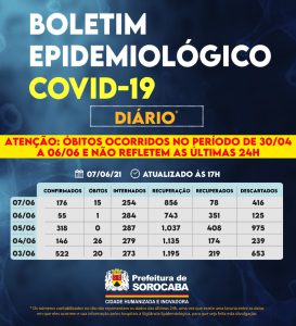 Sorocaba recebeu a notificação de mais 176 casos confirmados da Covid-19, 78 recuperados e 15 óbitos, estes ocorridos desde o dia 30 de abril, mas informados pelos hospitais à Vigilância Epidemiológica e computados apenas no dia de hoje (7 de junho). Do total de confirmados, 254 estão internados (132 em UTI) e o total de pessoas em recuperação (isolamento domiciliar) é 856.