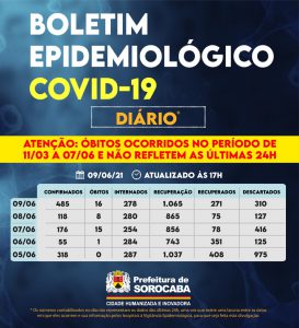Sorocaba recebeu a notificação de mais 485 casos confirmados da Covid-19, 271 recuperados e 16 óbitos, estes ocorridos desde o dia 11 de março, mas informados pelos hospitais à Vigilância Epidemiológica e computados apenas no dia de hoje (9 de junho). Do total de confirmados, 278 estão internados (151 em UTI) e o total de pessoas em recuperação (isolamento domiciliar) é 1.065.