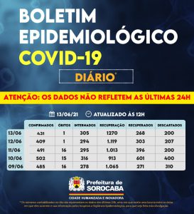 Sorocaba recebeu a notificação de mais 431 casos confirmados da Covid-19, 268 recuperados e um óbito, este ocorrido no dia 11 de junho, mas informados pelo hospital à Vigilância Epidemiológica e computado no dia de hoje (13 de junho). Do total de confirmados, 305 estão internados (159 em UTI) e o total de 146 pessoas em recuperação (isolamento domiciliar) é 1.270.