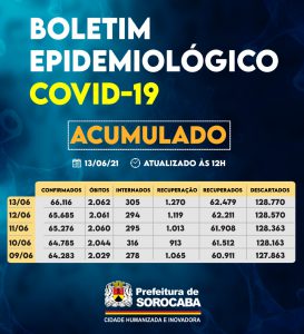 A Prefeitura de Sorocaba, por meio da Secretaria da Saúde (SES), registrou aumento do número de recuperados da Covid-19 neste domingo (13), chegando ao total de 62.479. Já, os casos confirmados com a doença passaram de 65.685 para 66.116 na cidade. Os óbitos confirmados da doença aumentaram para 2.062 e a taxa de letalidade no município é de 3,1%, abaixo da taxa estadual, que é de 3,4%, e acima da taxa nacional, que se encontra em 2,8%.