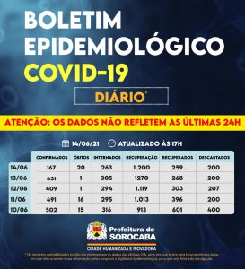 Sorocaba recebeu a notificação de mais 167 casos confirmados da Covid-19, 259 recuperados e 20 óbitos, estes ocorridos desde o dia 10 de junho, mas informados pelo hospitais à Vigilância Epidemiológica e computados no dia de hoje (14 de junho). Do total de confirmados, 263 estão internados (141 em UTI) e o total de pessoas em recuperação (isolamento domiciliar) é 1.200.
