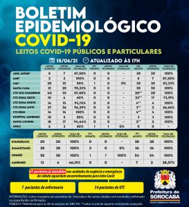 No censo diário de leitos da Covid-19 desta terça-feira (15), no Hospital Estadual Adib Jatene, sete leitos clínicos Covid estão ocupados, sendo oito pactuados. Já os 30 leitos de UTI Covid (Unidade de Terapia Intensiva) encontram-se 100% ocupados. Outro hospital de esfera estadual, o Conjunto Hospitalar de Sorocaba (CHS), possui 20 leitos clínicos Covid e 10 estão ocupados. O único leito de UTI infantil Covid encontra-se sem paciente. Dos 30 leitos de UTI Covid disponibilizados neste hospital, 25 estão ocupados. O AME possui dois leitos clínicos covid e dois estão ocupados. Dos oito leitos de UTI Covid deste local, sete possuem pacientes.
