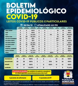 No censo diário de leitos da Covid-19 desta segunda-feira (28), no Hospital Estadual Adib Jatene, oito leitos clínicos Covid estão ocupados, sendo oito pactuados. Já os 30 leitos de UTI Covid (Unidade de Terapia Intensiva) encontram-se 100% ocupados. Outro hospital de esfera estadual, o Conjunto Hospitalar de Sorocaba (CHS), possui 17 leitos clínicos Covid e quatro estão ocupados. O único leito de UTI infantil Covid encontra-se sem paciente. Dos 32 leitos de UTI Covid disponibilizados neste hospital, 29 estão ocupados. O AME possui dois leitos clínicos covid e dois encontram-se ocupados. Dos oito leitos de UTI Covid deste local, oito possuem pacientes.