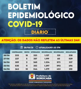 Sorocaba recebeu a notificação de mais 232 casos confirmados da Covid-19, 321 recuperados e 18 óbitos, estes ocorridos desde o dia 22 de junho, mas informados pelos hospitais à Vigilância Epidemiológica e computados no dia de hoje (28 de junho). Do total de confirmados, 323 estão internados (175 em UTI) e o total de pessoas em recuperação (isolamento domiciliar) é 1.127.