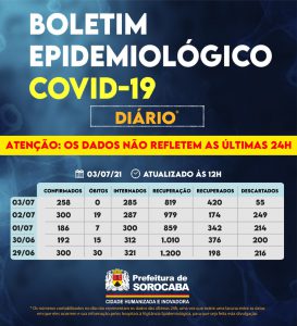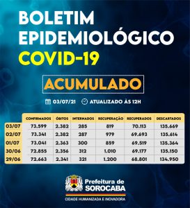 A Prefeitura de Sorocaba, por meio da Secretaria da Saúde (SES), registrou aumento do número de recuperados da Covid-19 neste sábado (3), chegando ao total de 70.113. Já, os casos confirmados com a doença passaram de 73.341 para 73.599 na cidade. Os óbitos confirmados se mantiveram em 2.382 e a taxa de letalidade no município é de 3,2%, abaixo da taxa estadual, que é de 3,4%, e acima da taxa nacional, que se encontra em 2,8%.