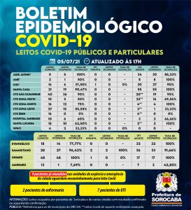 No censo diário de leitos da Covid-19 desta segunda-feira (5), no Hospital Estadual Adib Jatene, oito leitos clínicos Covid estão ocupados, sendo oito pactuados. Já os 34 leitos de UTI Covid (Unidade de Terapia Intensiva) encontram-se 88,23% ocupados. Outro hospital de esfera estadual, o Conjunto Hospitalar de Sorocaba (CHS), possui 16 leitos clínicos Covid e seis estão ocupados. O único leito de UTI infantil Covid encontra-se sem paciente. Dos 30 leitos de UTI Covid disponibilizados neste hospital, 27 estão ocupados. O AME possui dois leitos clínicos covid e um encontra-se ocupado. Dos oito leitos de UTI Covid deste local, oito possuem pacientes.
