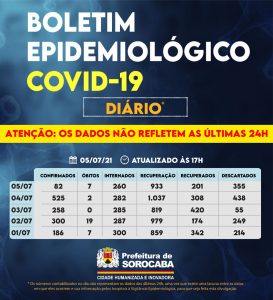 Sorocaba recebeu a notificação de mais 82 casos confirmados da Covid-19, 201 recuperados e sete óbitos, estes ocorridos desde o dia 2 de julho, mas informados pelos hospitais à Vigilância Epidemiológica e computados no dia de hoje (5 de julho). Do total de confirmados, 260 estão internados (151 em UTI) e o total de pessoas em recuperação (isolamento domiciliar) é 933.